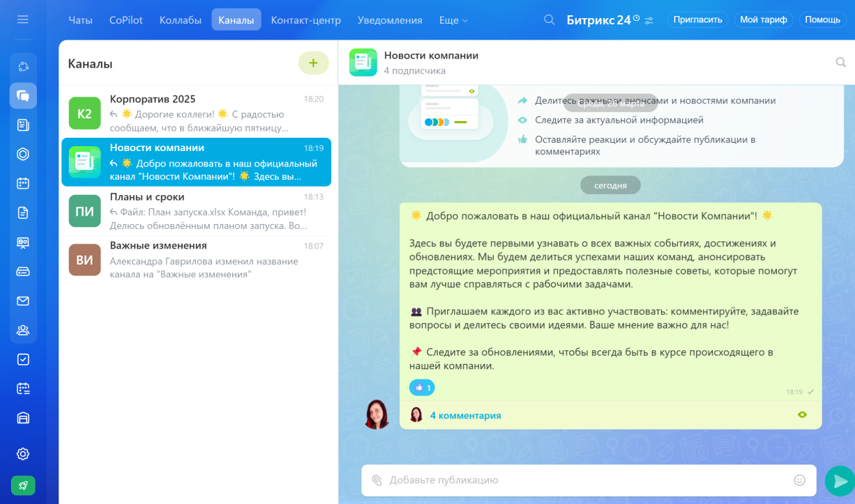 Каналы — это та же привычная подача информации, но внутри рабочего пространства Bitrix24, с автоматическим управлением подписками и понятными правилами, кто за что отвечает.