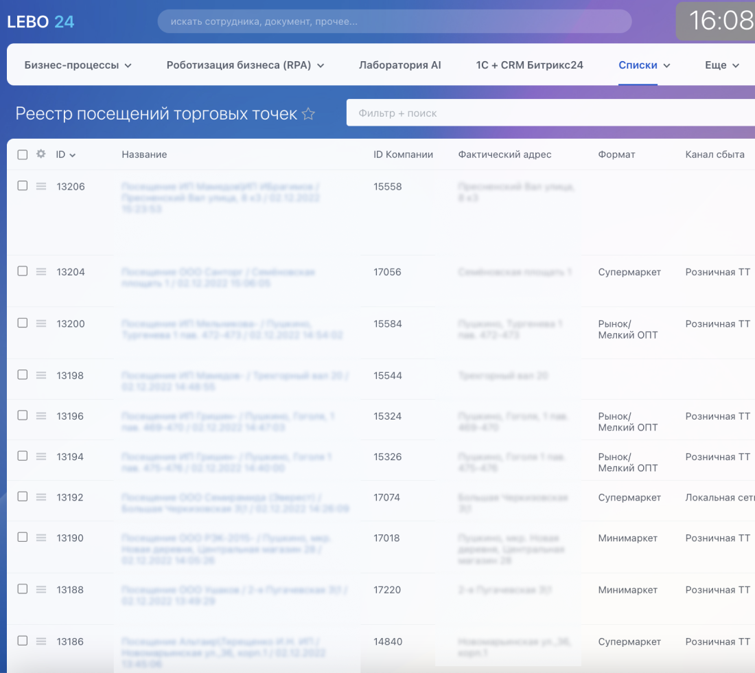 Реализация заняла всего один месяц. В рамках проекта был разработан реестр фиксации результатов посещения мест реализации (на функционале дополнительных списков «Битрикс24»), настроены права доступа к реестру для торговых представителей и руководителей, а также настроена и оптимизирована карточка CRM «Компании» для работы с торговыми точками. Также была произведена настройка автоматизации переноса в реестр базовой информации о каждой отдельной компании-партнере.